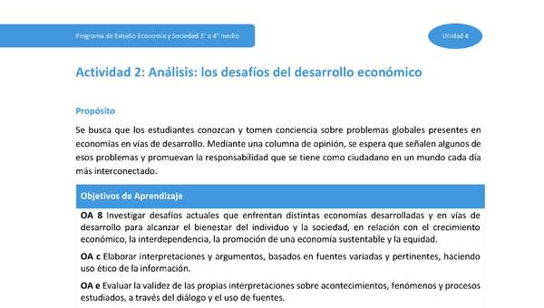 El propósito de esta unidad es que los estudiantes expliquen la economía como una ciencia social que estudia las decisiones que toman las personas en su vida cotidiana, así como la familia, el sector privado y el Estado enfrentan el problema de la escasez y qué factores inciden en la toma de decisiones sobre la asignación de estos recursos.
