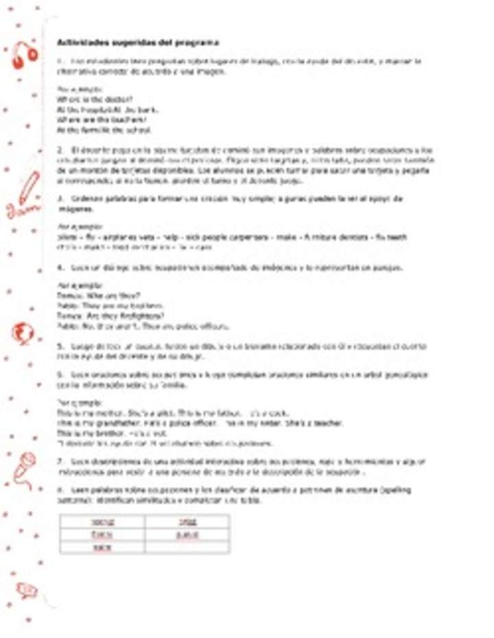 Leer y demostrar comprensión de textos relacionados con temas conocidos o de otras asignaturas -la escuela, animales salvajes, partes de la casa y muebles, figuras geométricas, ocupaciones, lugares en la ciudad, comida, celebraciones (Easter)-, y con las siguientes funciones: seguir y dar instrucciones; presentarse y presentar a otros; expresar habilidad, sentimientos, posesión y cantidades hasta el veinte; describir animales y objetos en un lugar; describir acciones que suceden al momento de hablar; solicitar y dar información sobre ocupaciones, comida y ubicación de personas y objetos.