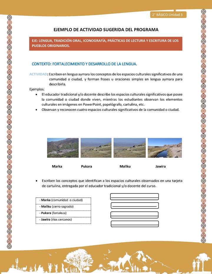 Escriben en lengua aymara los conceptos de los espacios culturales significativos de una comunidad o ciudad, y forman frases u oraciones simples en lengua aymara para describirla