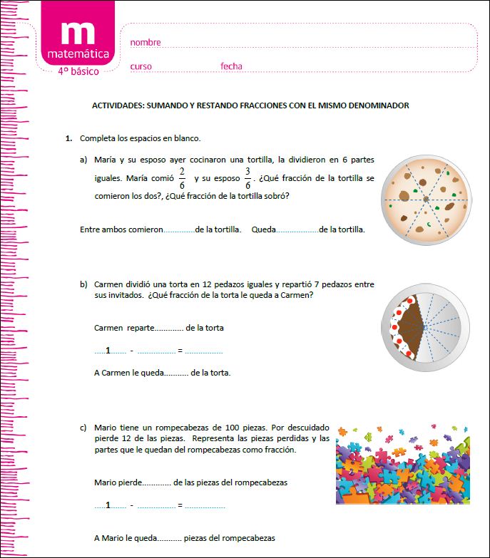 Resolver adiciones y sustracciones de fracciones con igual denominador (denominadores 100, 12, 10, 8, 6, 5, 4, 3, 2) de manera concreta y pictórica en el contexto de la resolución de problemas.