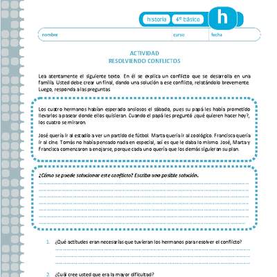 Resolver conflictos, aplicando estrategias como determinar la causa del problema, proponer posibles soluciones, dialogar, buscar un punto de vista común y votar, entre otras, demostrando respeto y empatía por las partes involucradas para mejorar la convivencia en el curso y en la comunidad escolar.