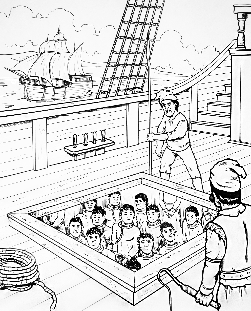 Ilustración que representa el tráfico de esclavos africanos a América (blanco y negro)