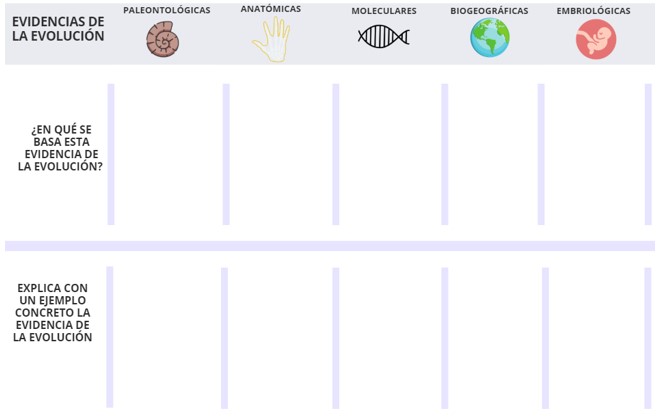 Existen diferentes evidencias de que la evolución de las especies realmente ocurrió. Completa el cuadro de las evidencias de la evolución.