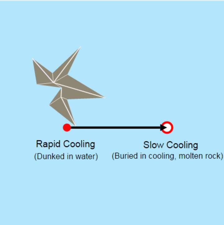 Las rocas ígneas se forman cuando el magma se enfría y solidifica. El tipo de roca ígnea formada depende de qué tan profundo en la tierra esté el magma cuando esto ocurra, y qué tan rápido se enfríe. Arrastre el punto rojo debajo del cristal para cambiar la cantidad de tiempo que pasó enfriándose.