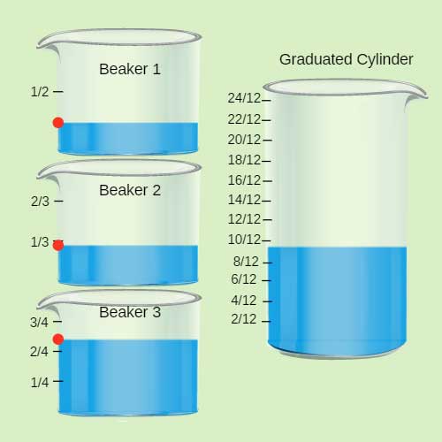 Josh está agregando tres cantidades de agua a un cilindro graduado grande. El vaso de precipitados @ $ 1 @ $ tiene un contenedor de @ $ \ frac {1} {2} @ $ litros de agua, el vaso de precipitados @ $ 2 @ $ tiene @ $ \ frac {2} {3} @ $ litros de agua y el vaso de precipitados @ $ 3 @ $ tiene