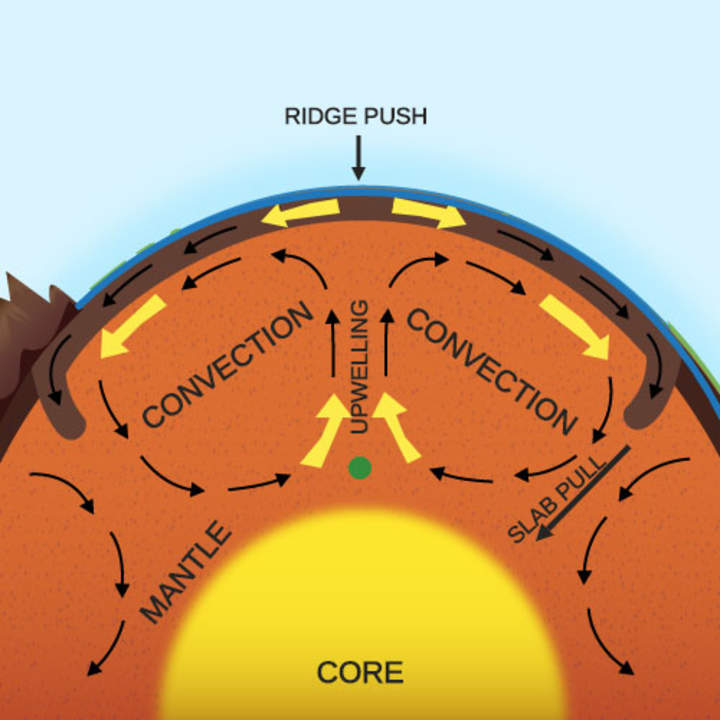 Las placas tectónicas que forman la corteza terrestre están en movimiento. El movimiento es causado por las células de convección que ocurren cuando el material caliente se eleva y el material frío se hunde en un patrón circular. Arrastre el punto verde hacia arriba para demostrar la corriente ascendente. Tenga en cuenta el movimiento de las celdas de convección.
