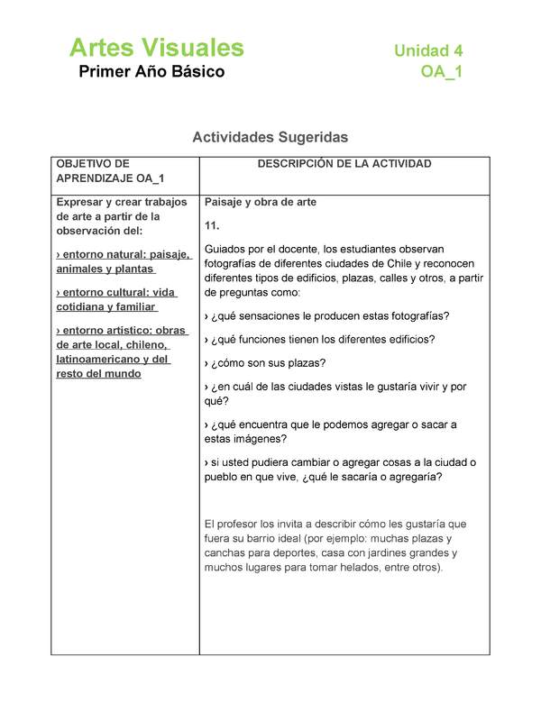 Expresar y crear trabajos de arte a partir de la observación del: entorno natural: paisaje, animales y plantas; entorno cultural: vida cotidiana y familiar; entorno artístico: obras de arte local, chileno, latinoamericano y del resto del mundo.