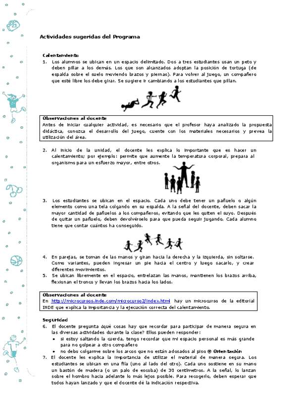 Practicar actividades físicas, demostrando comportamientos seguros, como: realizar un calentamiento en forma apropiada; utilizar de manera adecuada los materiales y las instalaciones para evitar el riesgo personal y de otros; escuchar y seguir instrucciones; asegurar de que el espacio está libre de obstáculos.