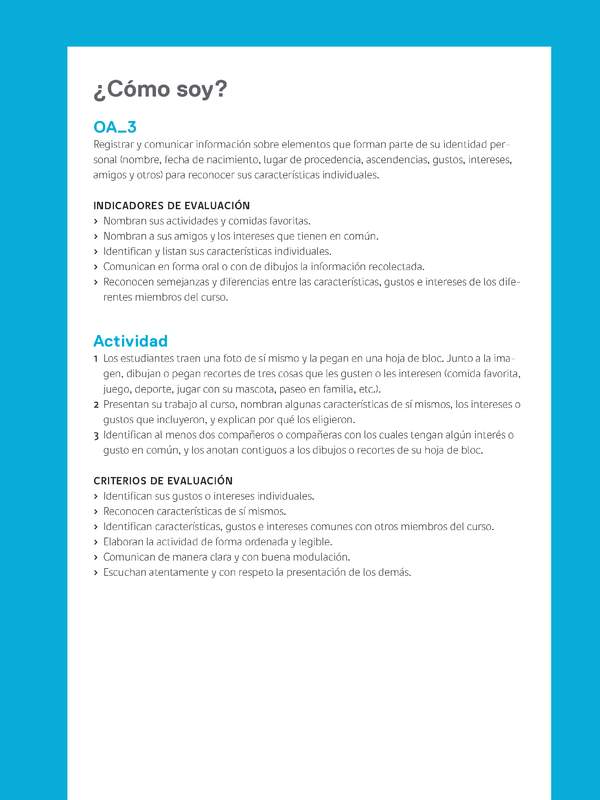 Registrar y comunicar información sobre elementos que forman parte de su identidad personal (nombre, fecha de nacimiento, lugar de procedencia, ascendencias, gustos, intereses, amigos y otros) para reconocer sus características individuales.