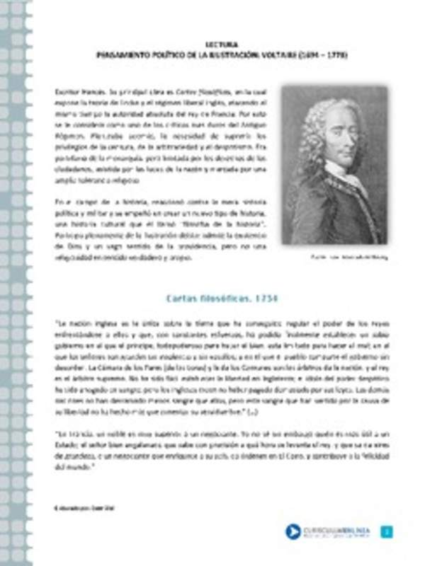 Caracterizar la Ilustración como corriente de pensamiento basada en la razón, considerando sus principales ideas tales como el ordenamiento constitucional, la separación y el equilibrio de poderes del Estado, los principios de libertad, igualdad y soberanía popular y la secularización, y fundamentar su rol en la crítica al absolutismo y en la promoción del ideario republicano.