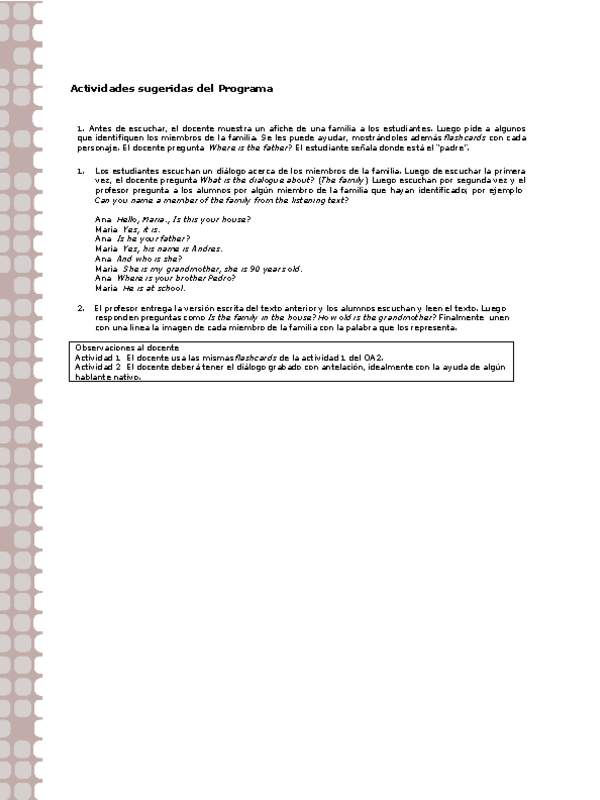 Expresiones básicas y vocabulario de la escuela y la familia. Sonidos del alfabeto y canciones. Información básica sobre otras culturas.