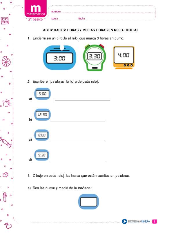 Leer horas y medias horas en relojes digitales, en el contexto de la resolución de problemas.
