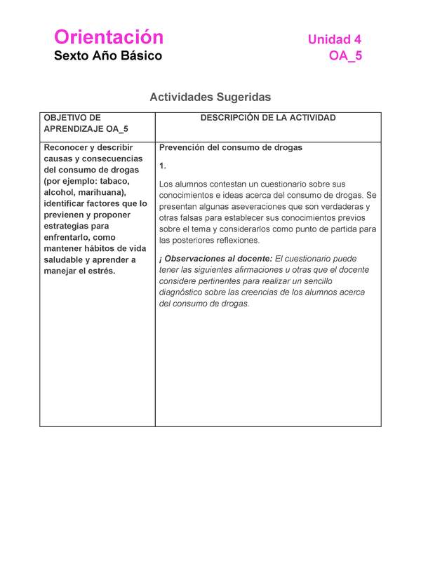 Reconocer y describir causas y consecuencias del consumo de drogas (por ejemplo, tabaco, alcohol, marihuana), identificar factores que lo previenen y proponer estrategias para enfrentarlo, como mantener hábitos de vida saludable y aprender a manejar el stress.