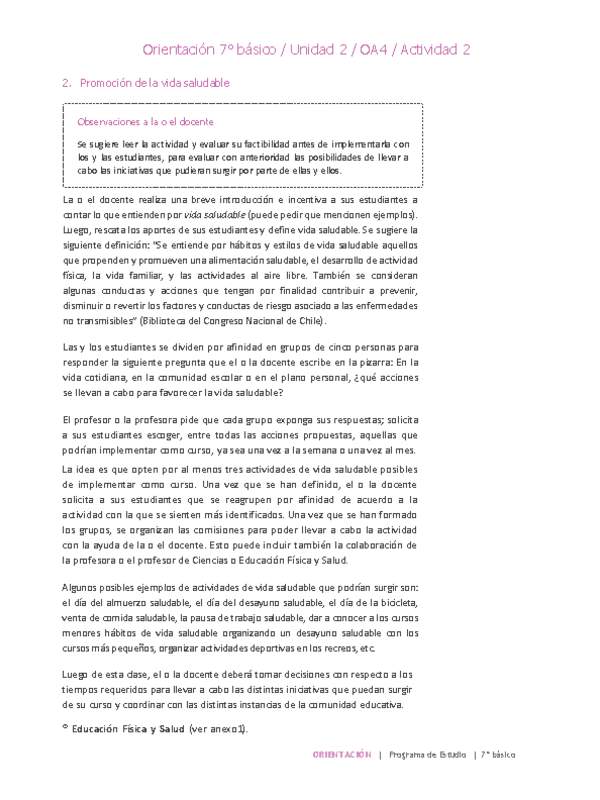 Integrar a su vida cotidiana acciones que favorezcan el bienestar y la vida saludable en el plano personal y en la comunidad escolar, optando por una alimentación saludable, un descanso apropiado, realizando actividad física o practicando deporte, resguardando la intimidad e integridad del cuerpo, incorporando medidas de seguridad en el uso de redes sociales, entre otros.