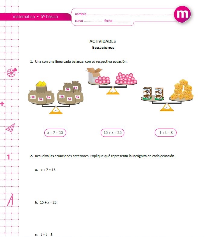 Guía de ejercicios que implica resolver ecuaciones en forma simbólica o pictórica.