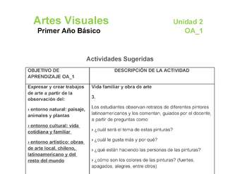 Expresar y crear trabajos de arte a partir de la observación del: entorno natural: paisaje, animales y plantas; entorno cultural: vida cotidiana y familiar; entorno artístico: obras de arte local, chileno, latinoamericano y del resto del mundo.