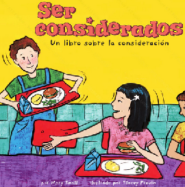 Texto informativo ilustrado con fotografías que describe acciones concretas que demuestran consideración por los miembros en la escuela, el hogar y la comunidad.