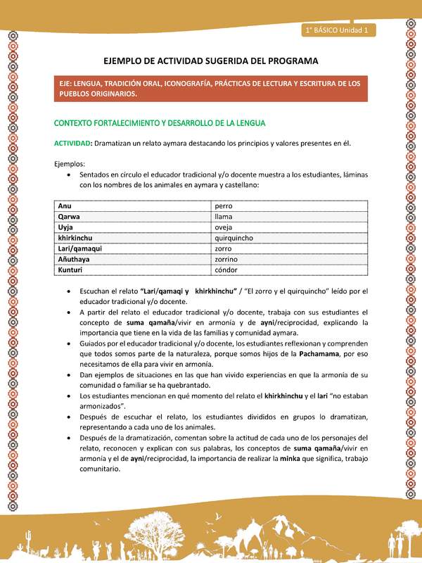 Relacionar con sus propios conocimientos y experiencias, información cultural significativa de los pueblos, en relatos que escuchan o les son leídos, que incluyan palabras o expresiones en lengua indígena o en castellano, según sea el caso.