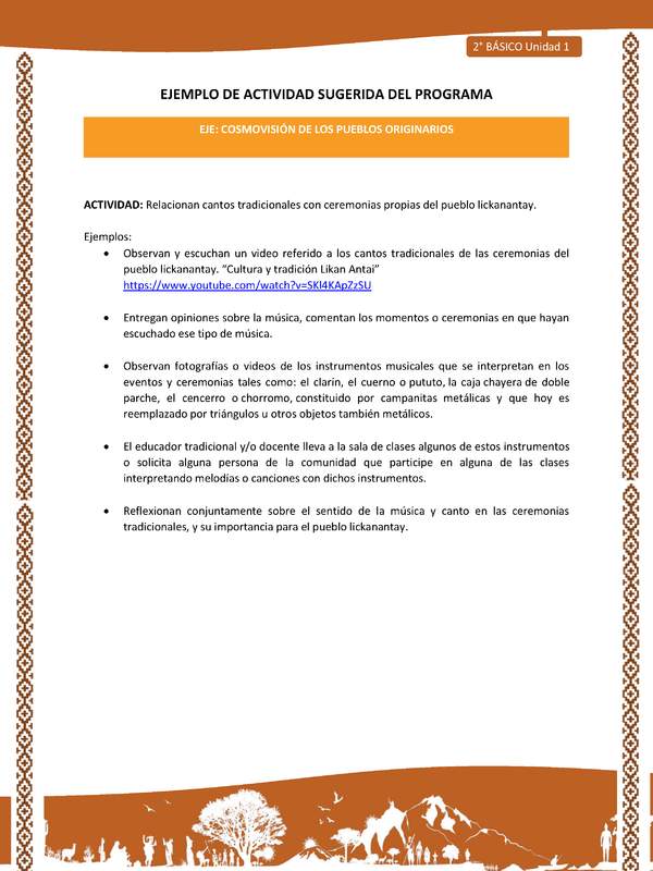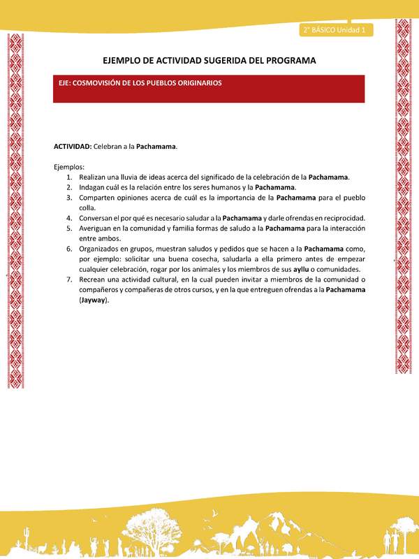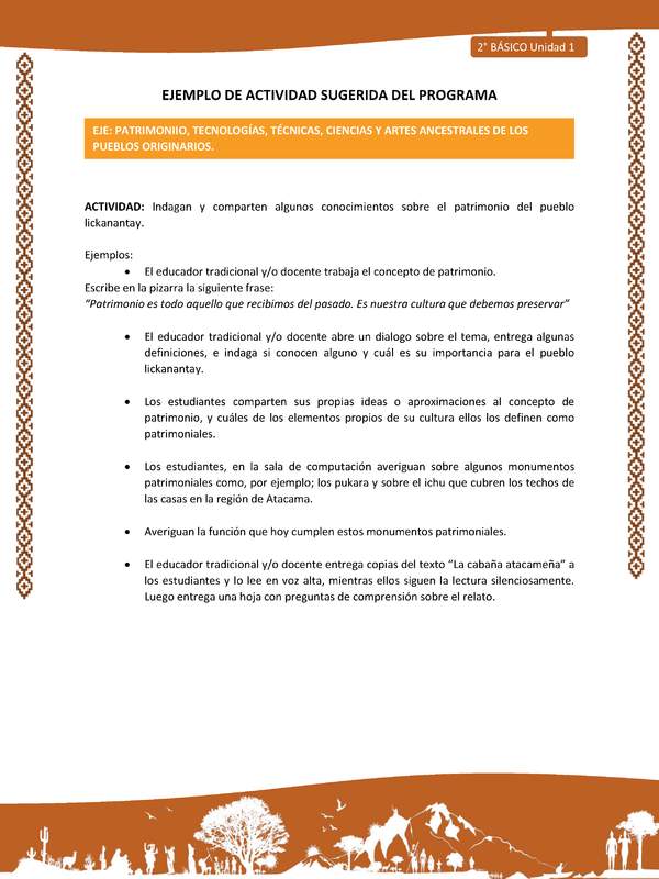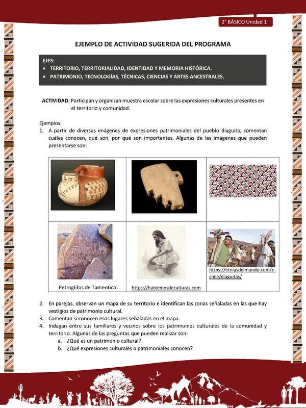 Reconocer diversas expresiones del patrimonio cultural de su comunidad, territorio y pueblo indígena que corresponda, como manifestaciones propias, relativas a: comidas, ceremonias, sitios arqueológicos, espacios naturales, entre otras.