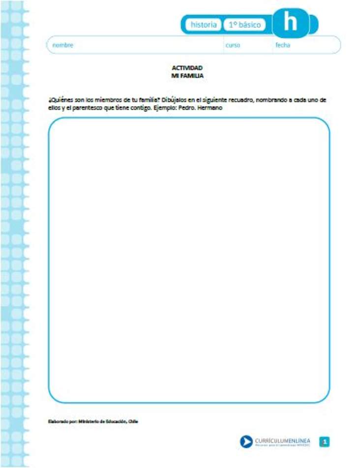Actividad donde dibuja a su familia, escribe sus nombres y el parentesco con ellos