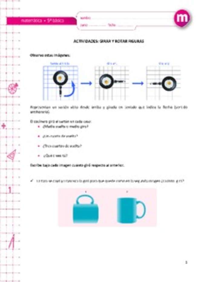 Actividades que implican identificar y describir formas que han sigo giradas o rotadas respecto a un punto y también determinar la medida del giro.