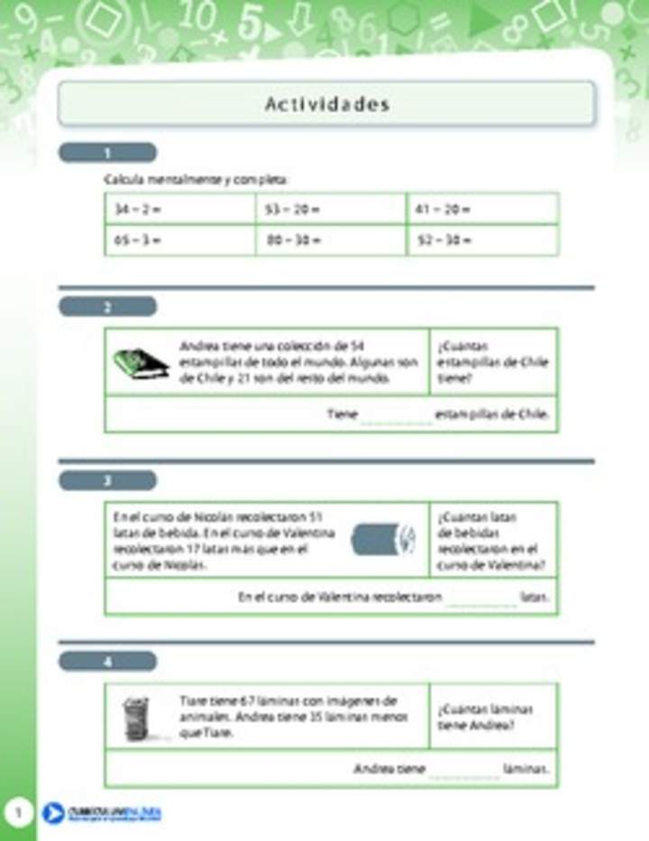 Actividades para ejercitar la sustracción de números naturales menores a 100.