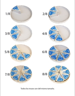 Imagen que muestra un queso circular dividido en octavos, se muestra además la imagen que representa 1/8 del queso, 2/8, etc.