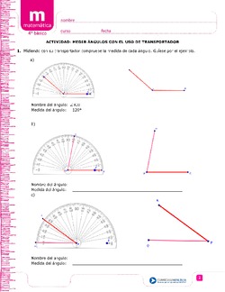 Guía de actividades que muestra como medir ángulos con el uso de transportador. Además pregunta sobre comparar la medida de ángulos una vez medidos.