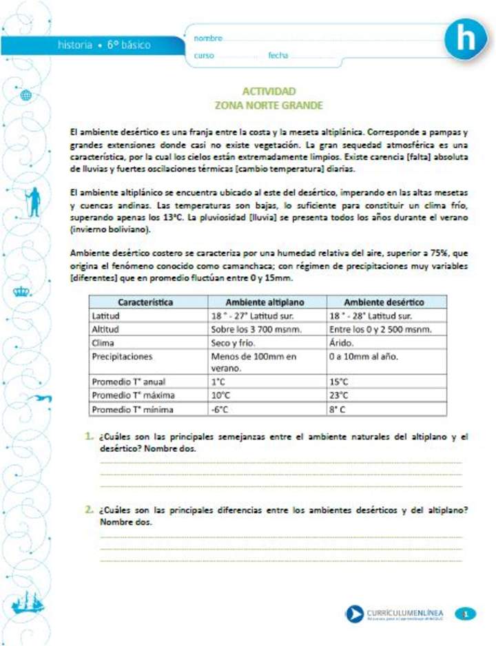 Comparar diversos ambientes naturales en Chile (desértico, altiplánico, costero, mediterráneo, andino, frío y lluvioso, patagónico y polar), considerando como criterios las oportunidades y las dificultades que presentan y cómo las personas las han aprovechado y superado para vivir y desarrollarse.