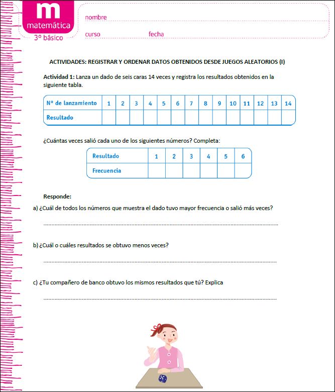 Actividades para registrar datos obtenidos desde juegos aleatorios en tablas de frecuencia y responder preguntas.