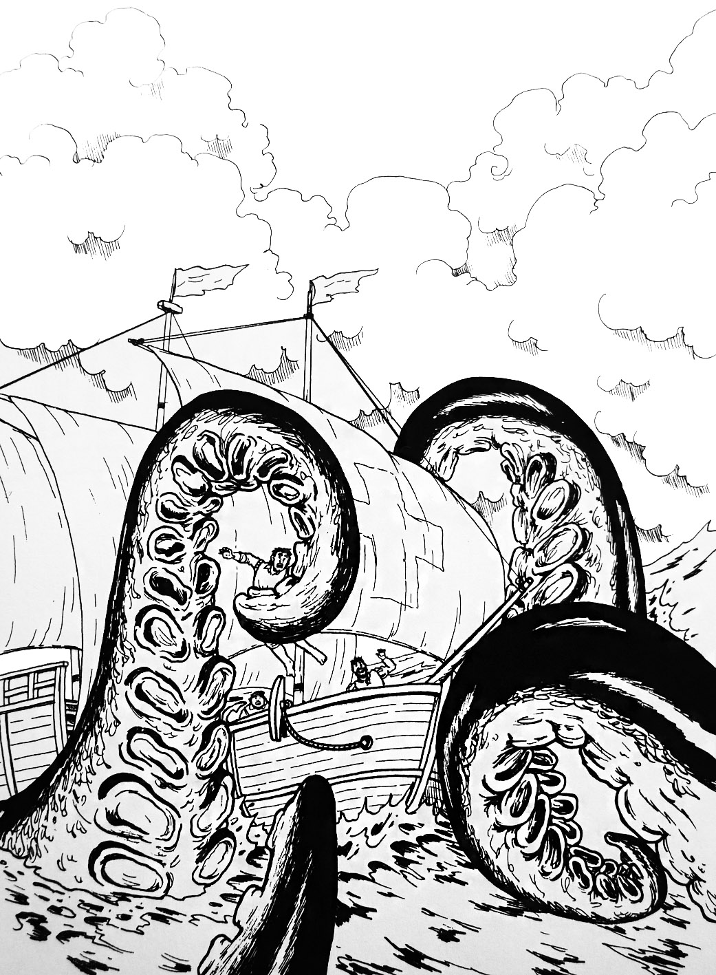 Ilustración que representa la visión de los europeos sobre los monstruos marinos en alta mar (blanco y negro)