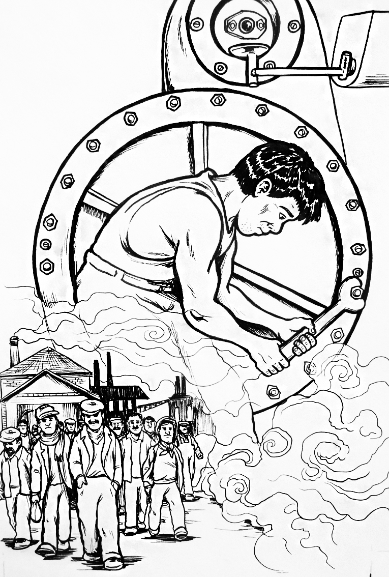 Ilustración que representa la vida de hombres en el proletariado durante la revolución industrial (blanco y negro)