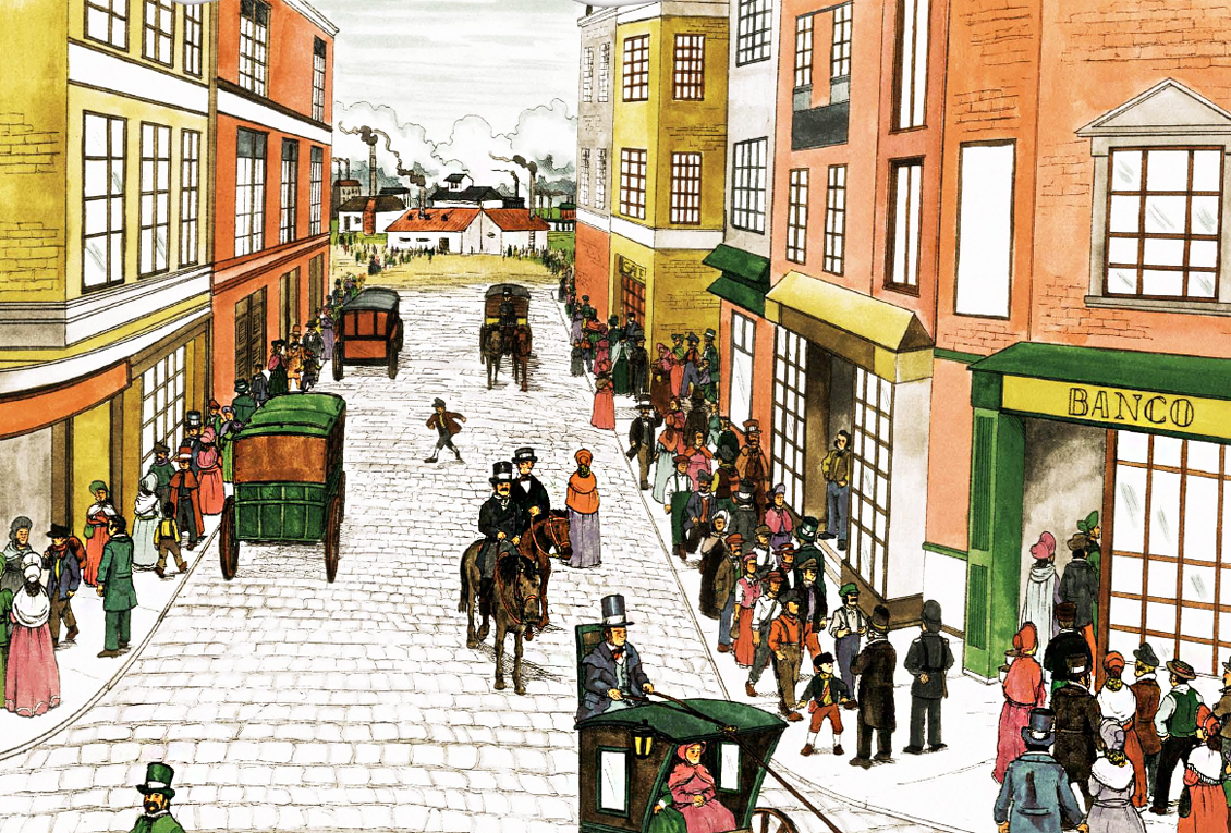 Ilustración que representa la migración del campo a la ciudad durante la revolución industrial (color)