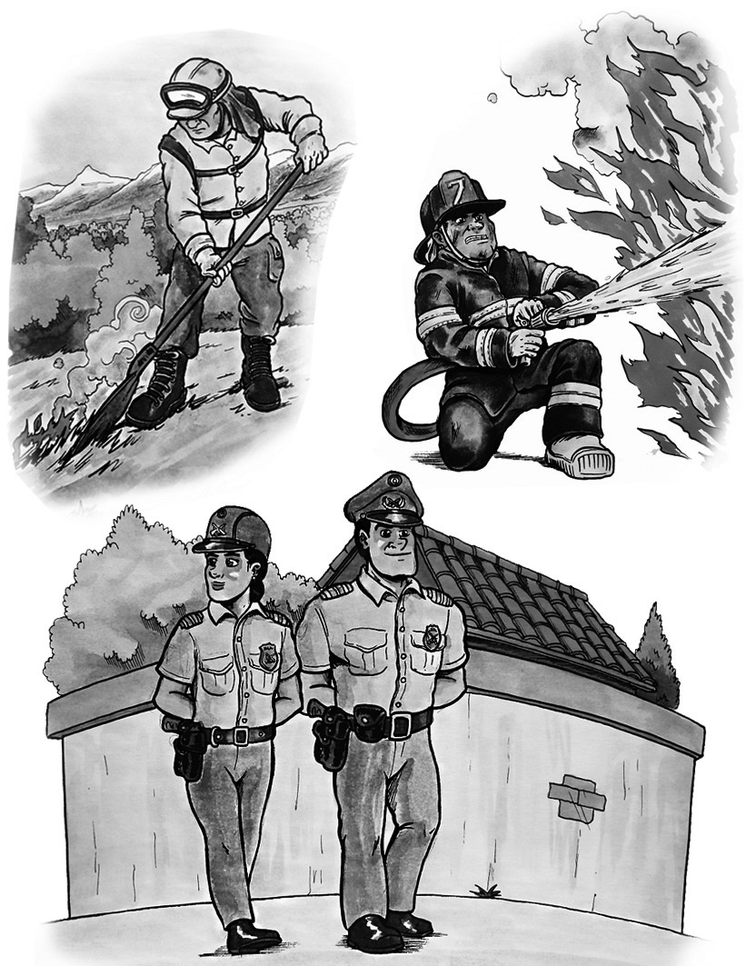 Ilustración con representantes de instituciones al servicios de la comunidad (blanco y negro)