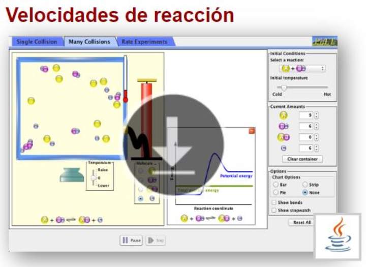 Explora lo que hace que ocurra una reacción al chocar átomos y moléculas. Diseña experimentos con diferentes reacciones, concentraciones y temperaturas. ¿Cuándo son reversibles las reacciones? ¿Qué afecta la velocidad de una reacción?.
