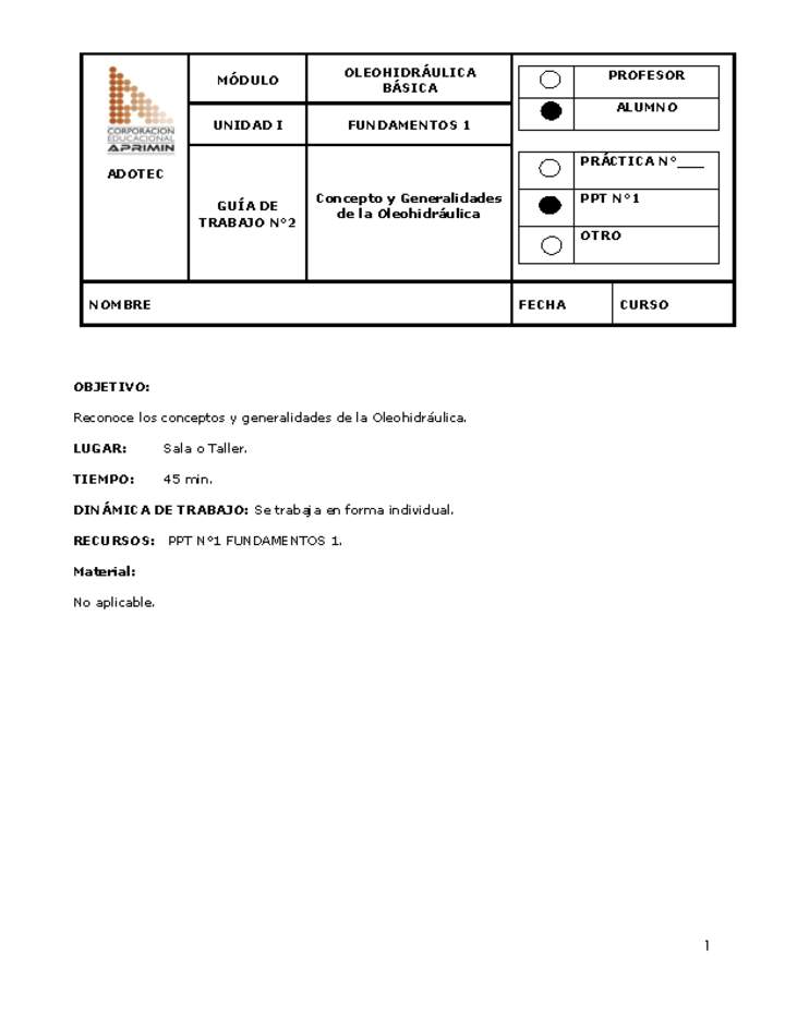 Guía de trabajo del estudiante Oleo-hidráulica, concepto y generalidades de la oleo-hidráulica.